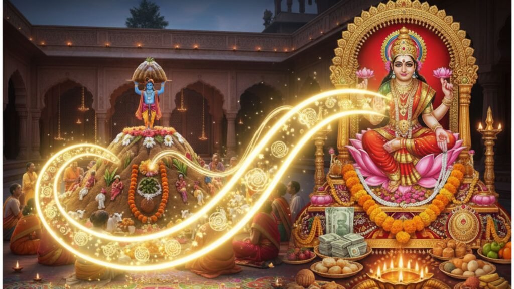 During this auspicious festival, devotees also seek the divine grace of Goddess Lakshmi. Her blessings symbolize prosperity, purity, and inner wealth. It is believed that those who perform Govardhan Pooja with sincere devotion attract both material and spiritual abundance.