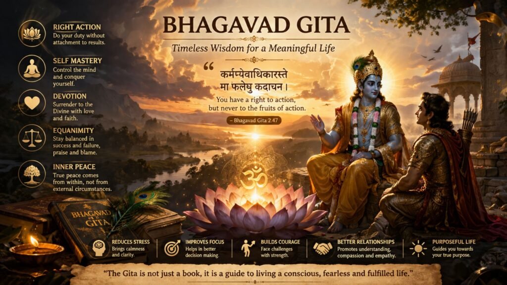 When Arjuna stood broken on the battlefield of Kurukshetra, he faced fear, emotional conflict, and moral confusion. In that moment, Bhagavad Gita emerged as a dialogue of eternal wisdom through Krishna.